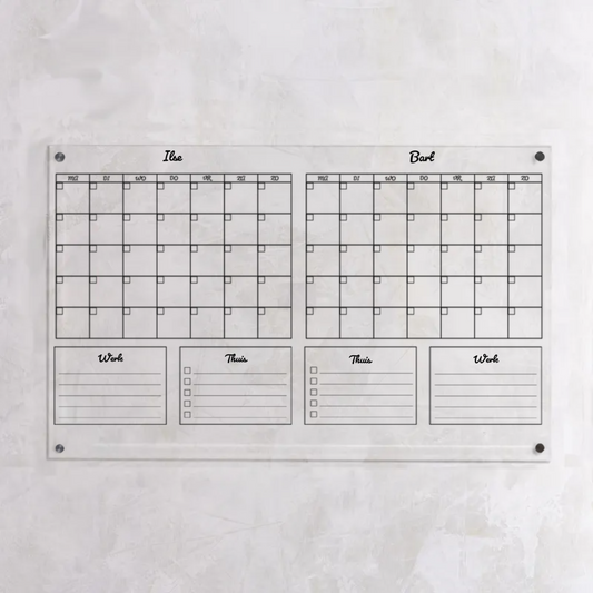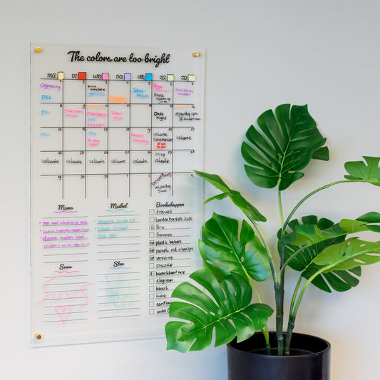 Nous comprenons qu'un tableau de planification de bureau doit être élégant et professionnel, tandis qu'un tableau de planification de cuisine peut être un peu plus ludique. Choisissez les couleurs, le style d'écriture, le format et si vous souhaitez un agenda hebdomadaire ou mensuel. Jetez un œil à notre boutique en ligne et découvrez quel tableau de planification vous convient parfaitement !